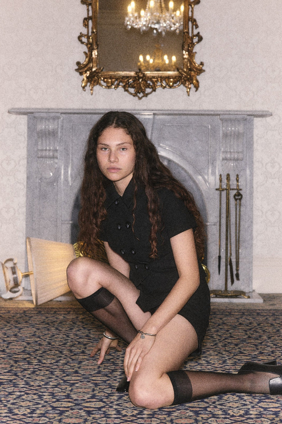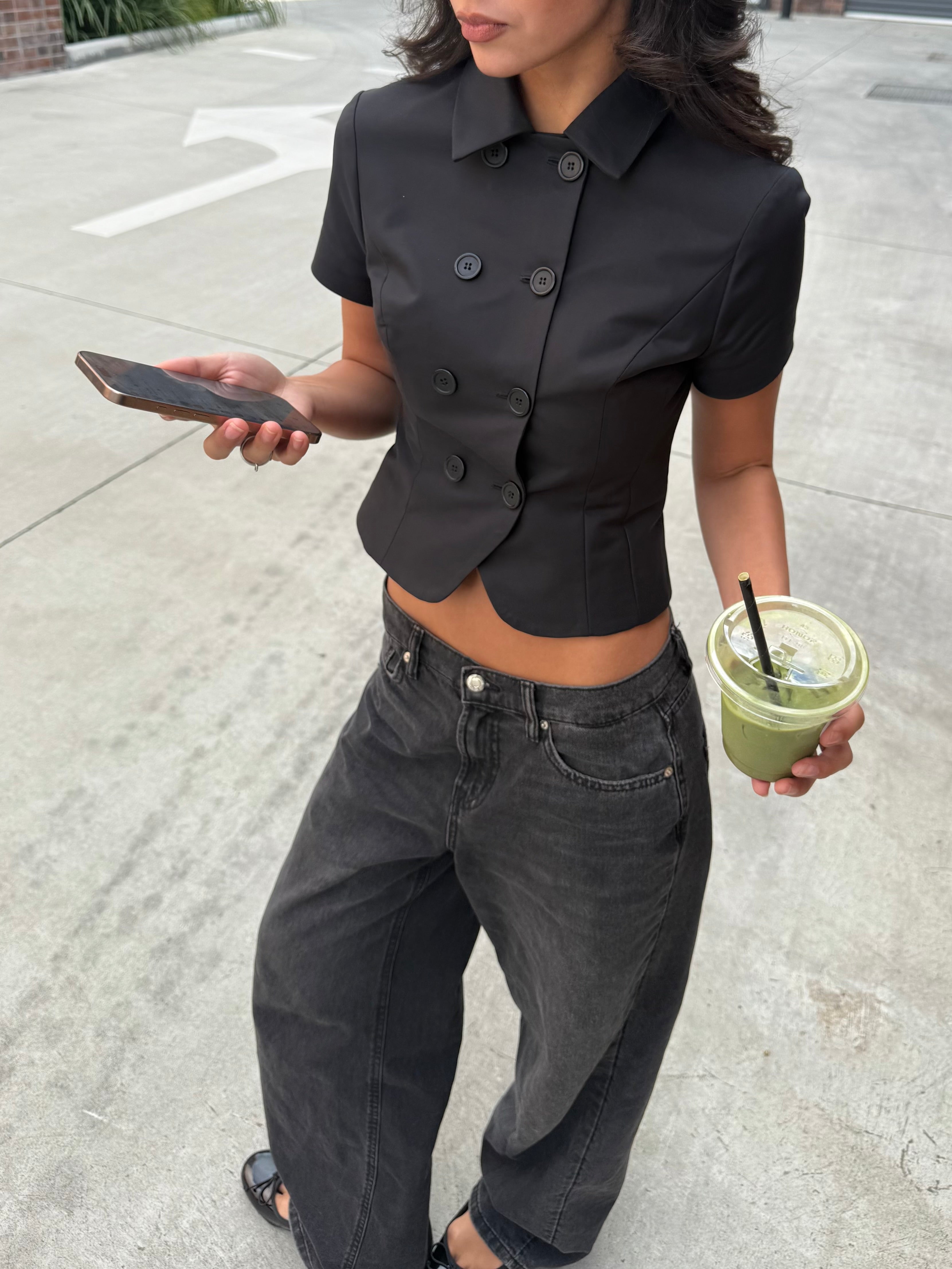 Tailored like a trench, softened for your everyday wardrobe. This short-sleeve top features double-breasted buttons, a pointed collar, and a slight flare through the waist for a flattering fit.