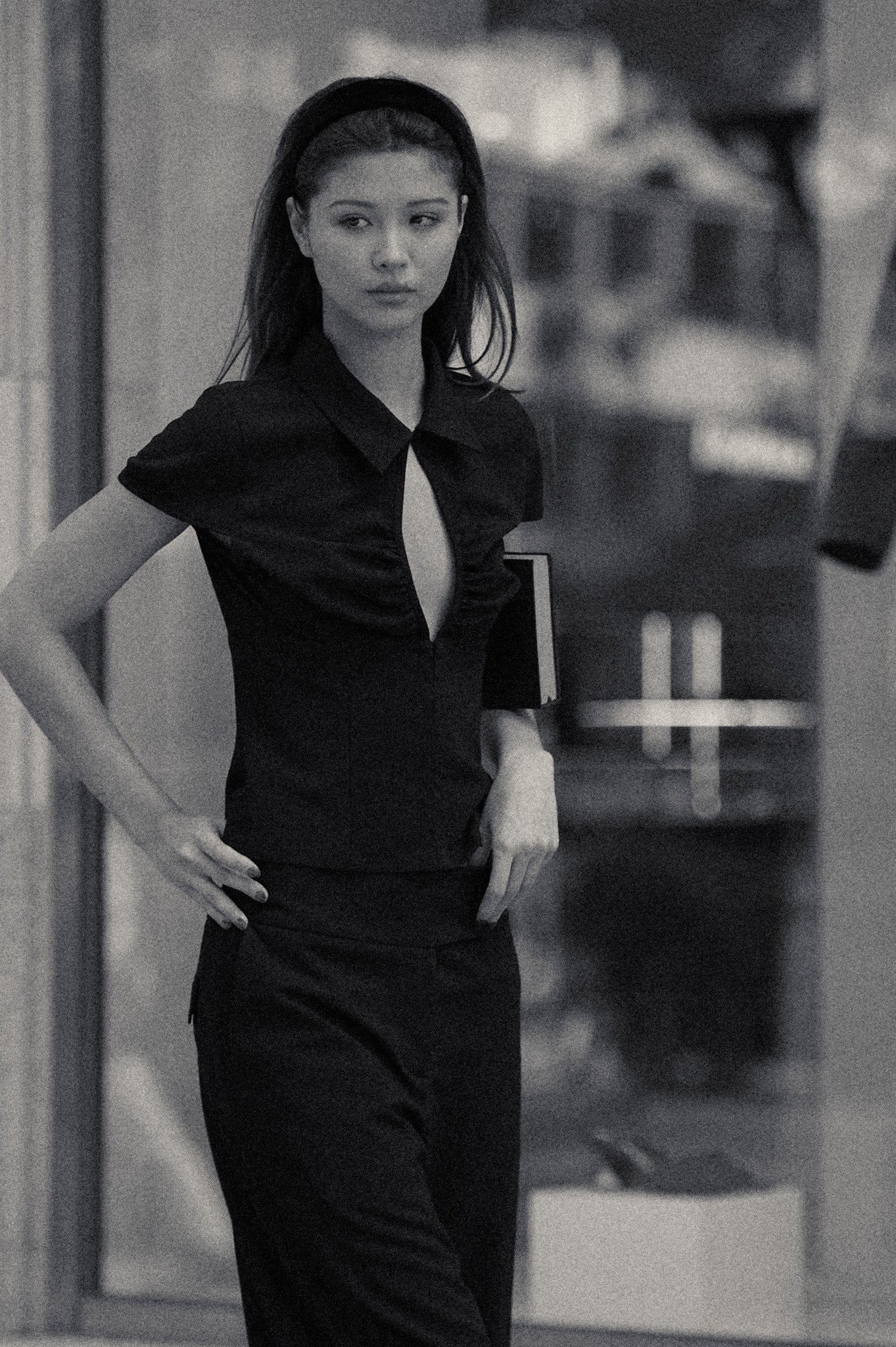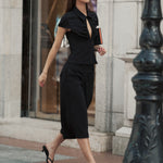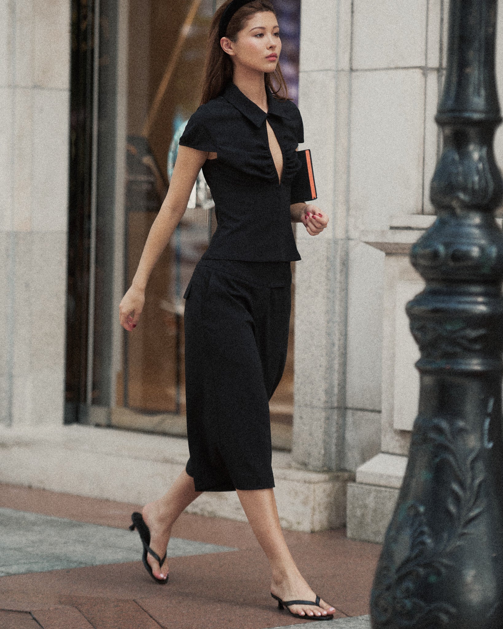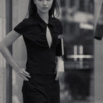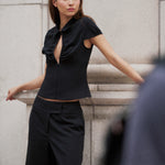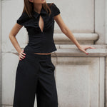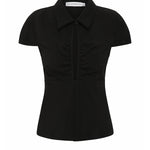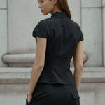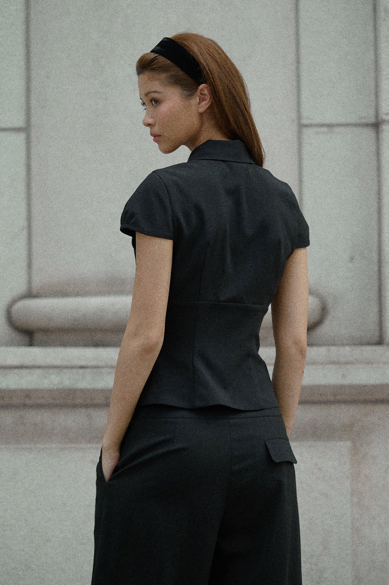 Crafted from premium suiting fabric, our Gathered Bust Blouse features a beautifully ruched neckline, finished with pipe binding. A hook and eye closure at the waist and capped sleeves are designed for a flattering, sculpted silhouette. The perfect piece for day-to-night dressing.