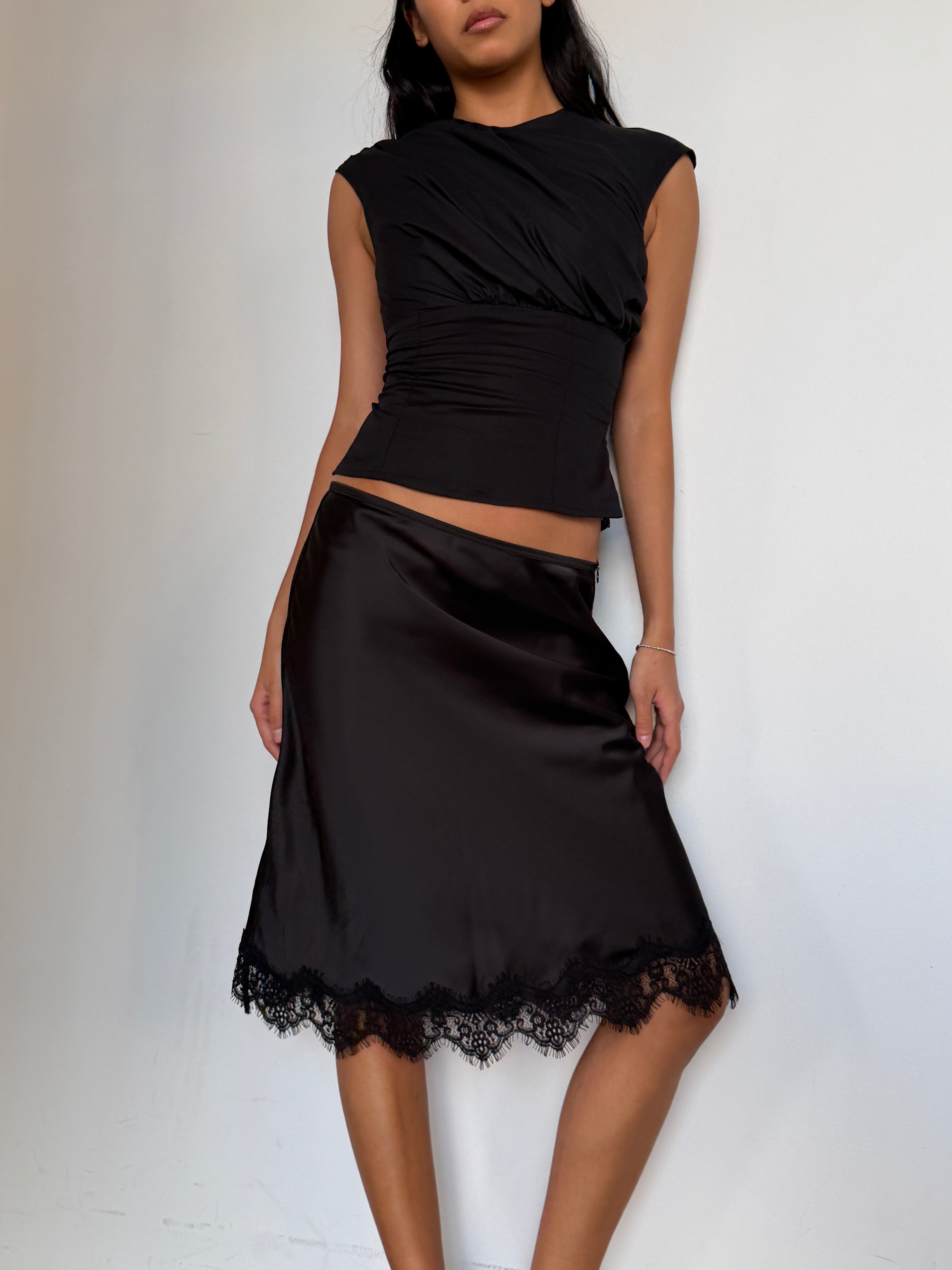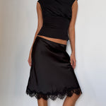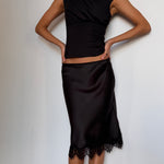Introducing the Lace Trim Midi Skirt. Designed to sit at a low-rise point, this style falls smoothly through the body with a soft, fluid finish. Completed with a delicate scalloped lace trim at the hem, it balances ease and femininity in a refined, minimal silhouette.