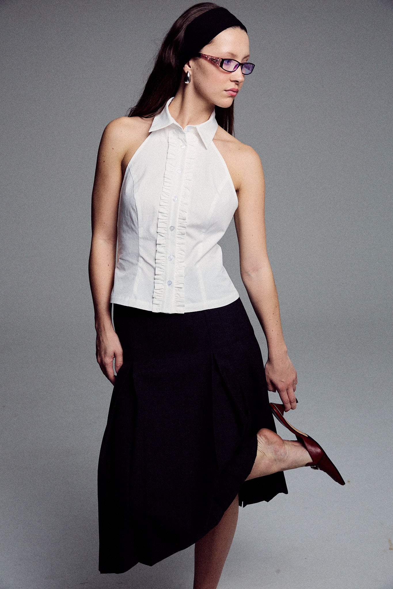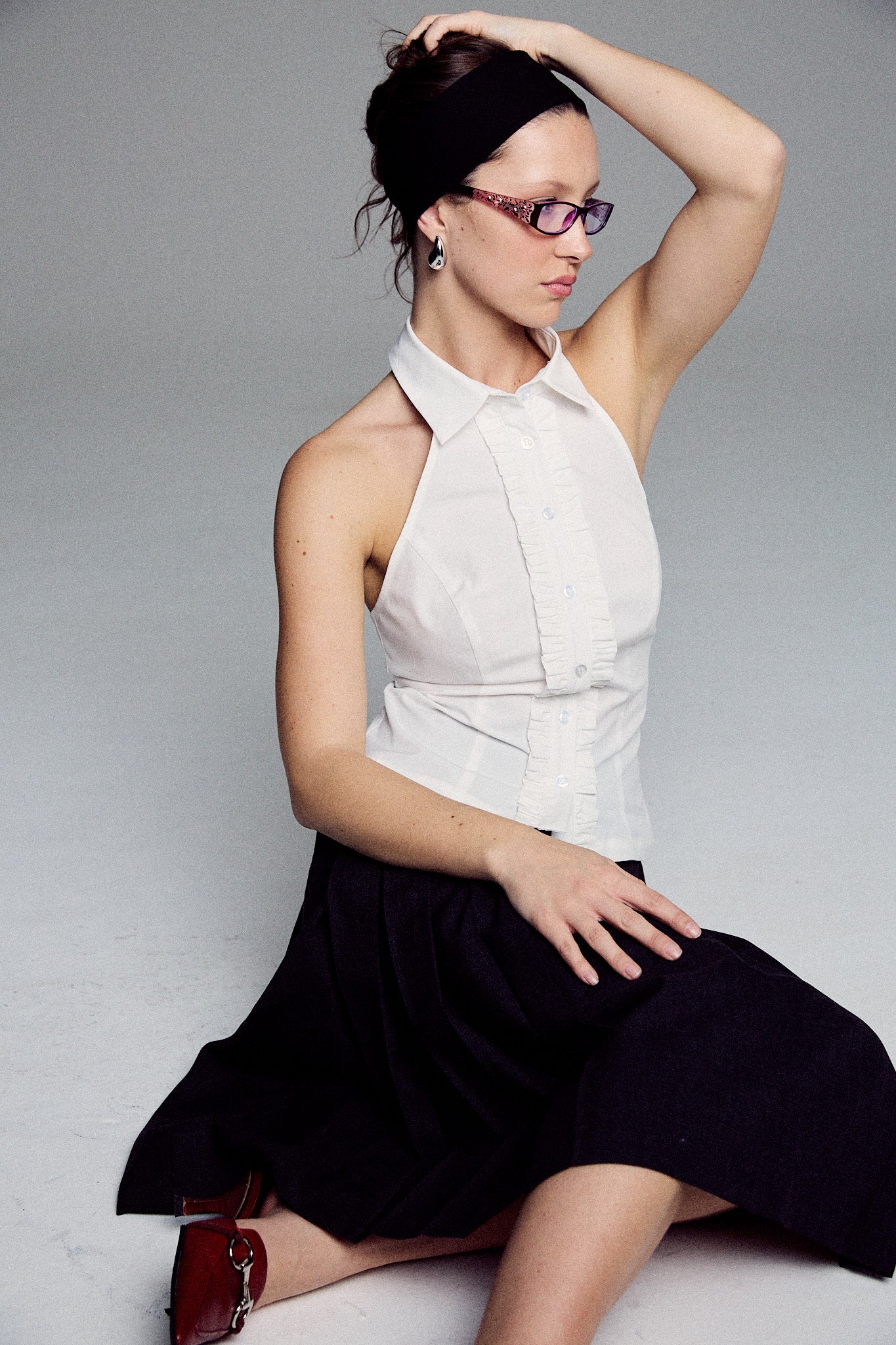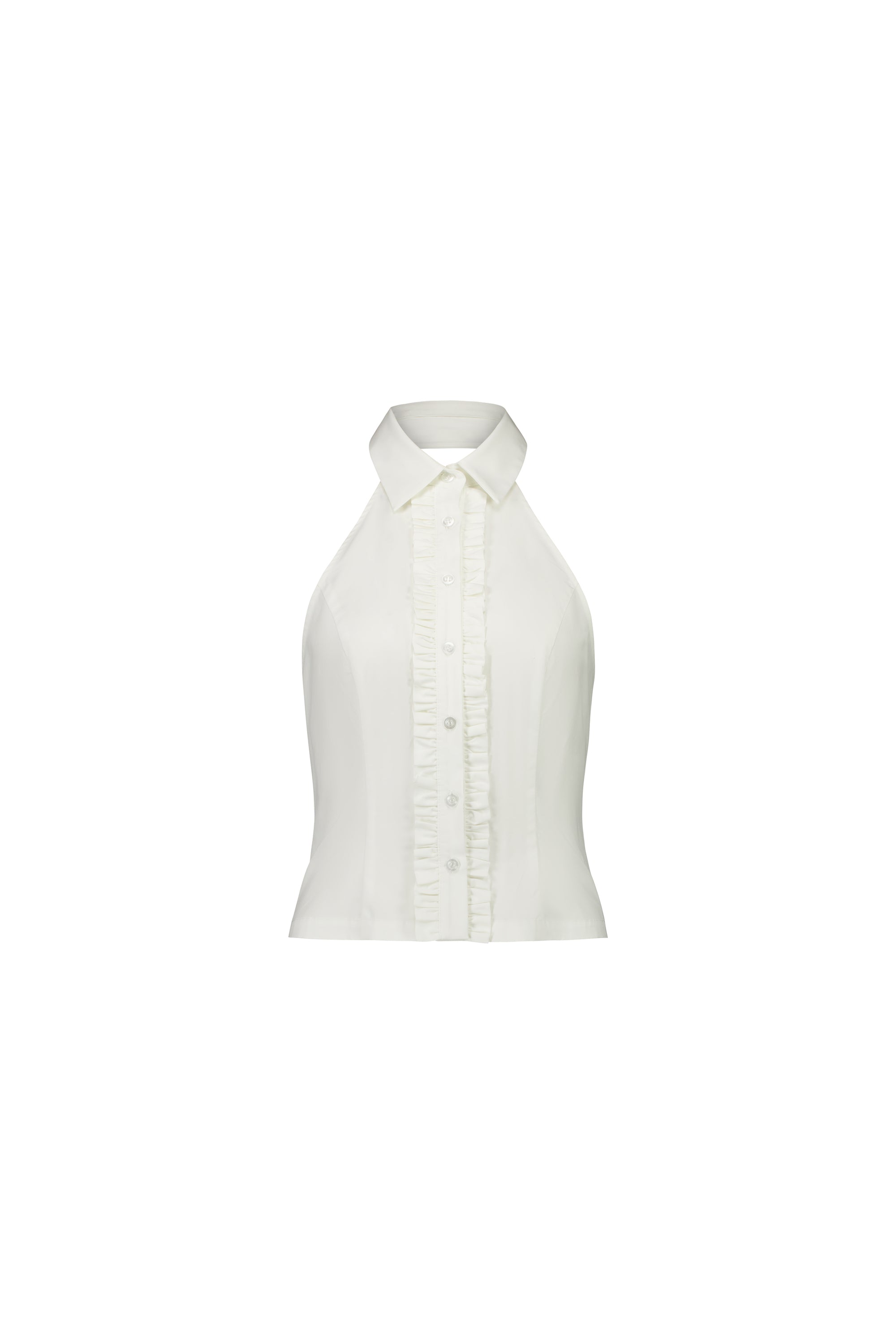 Introducing the Ruffle Halter Shirt, a statement piece that seamlessly marries classic elegance with modern sophistication. This refined halter top features a high collar and a sleek button-down front.