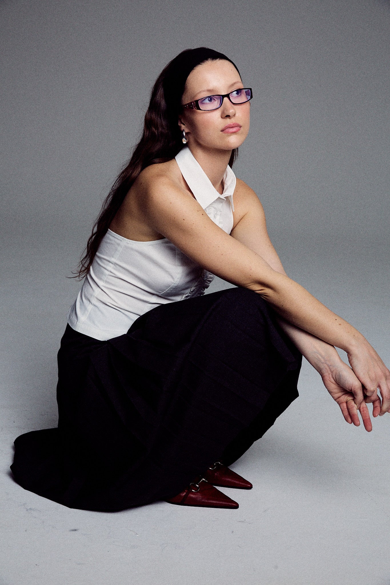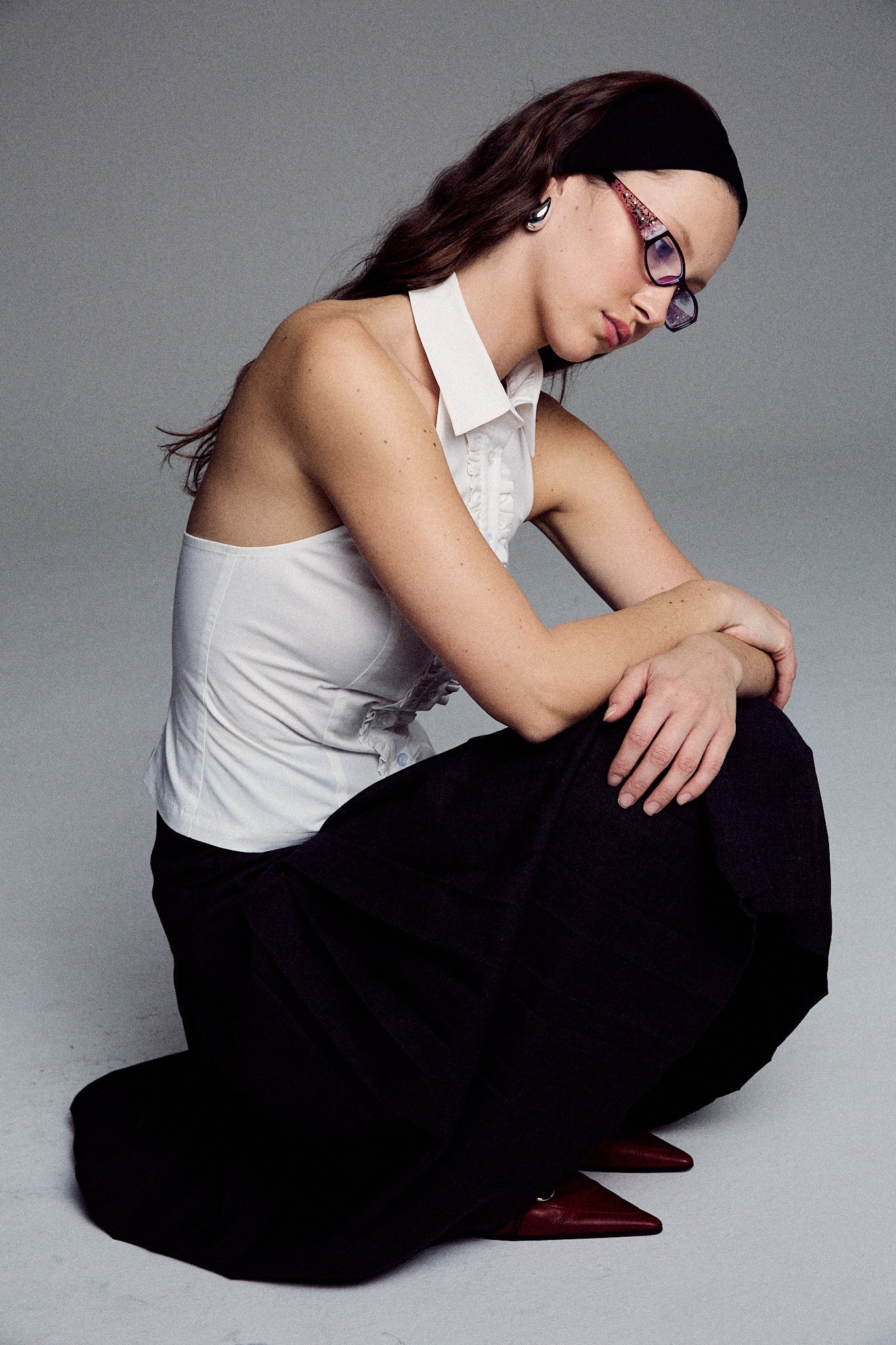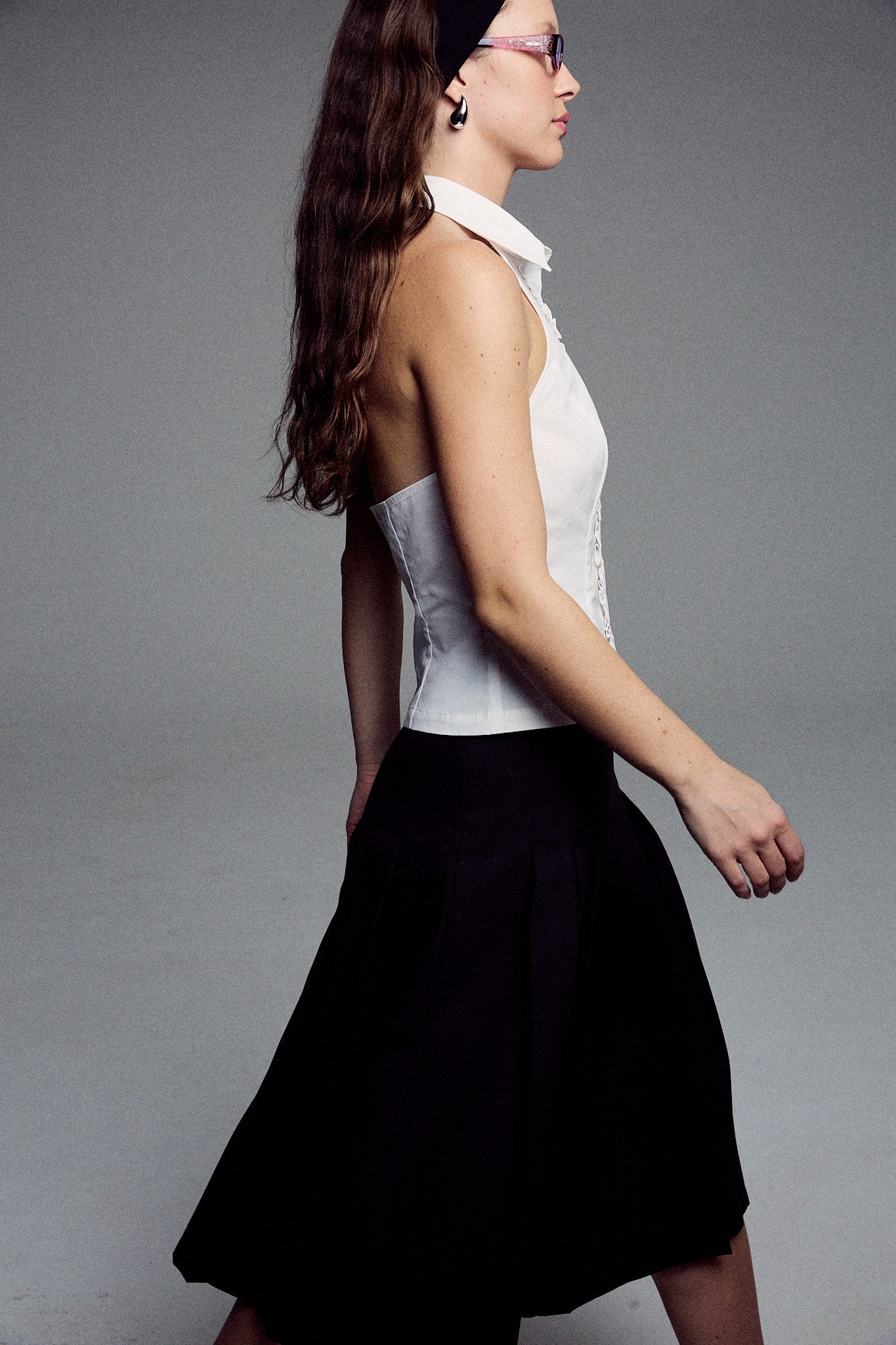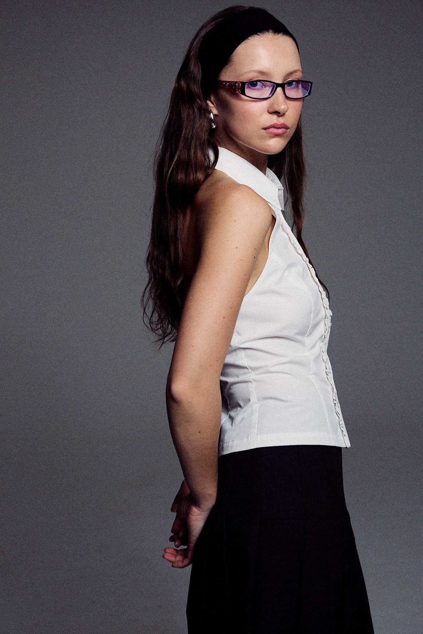 Introducing the Ruffle Halter Shirt, a statement piece that seamlessly marries classic elegance with modern sophistication. This refined halter top features a high collar and a sleek button-down front.