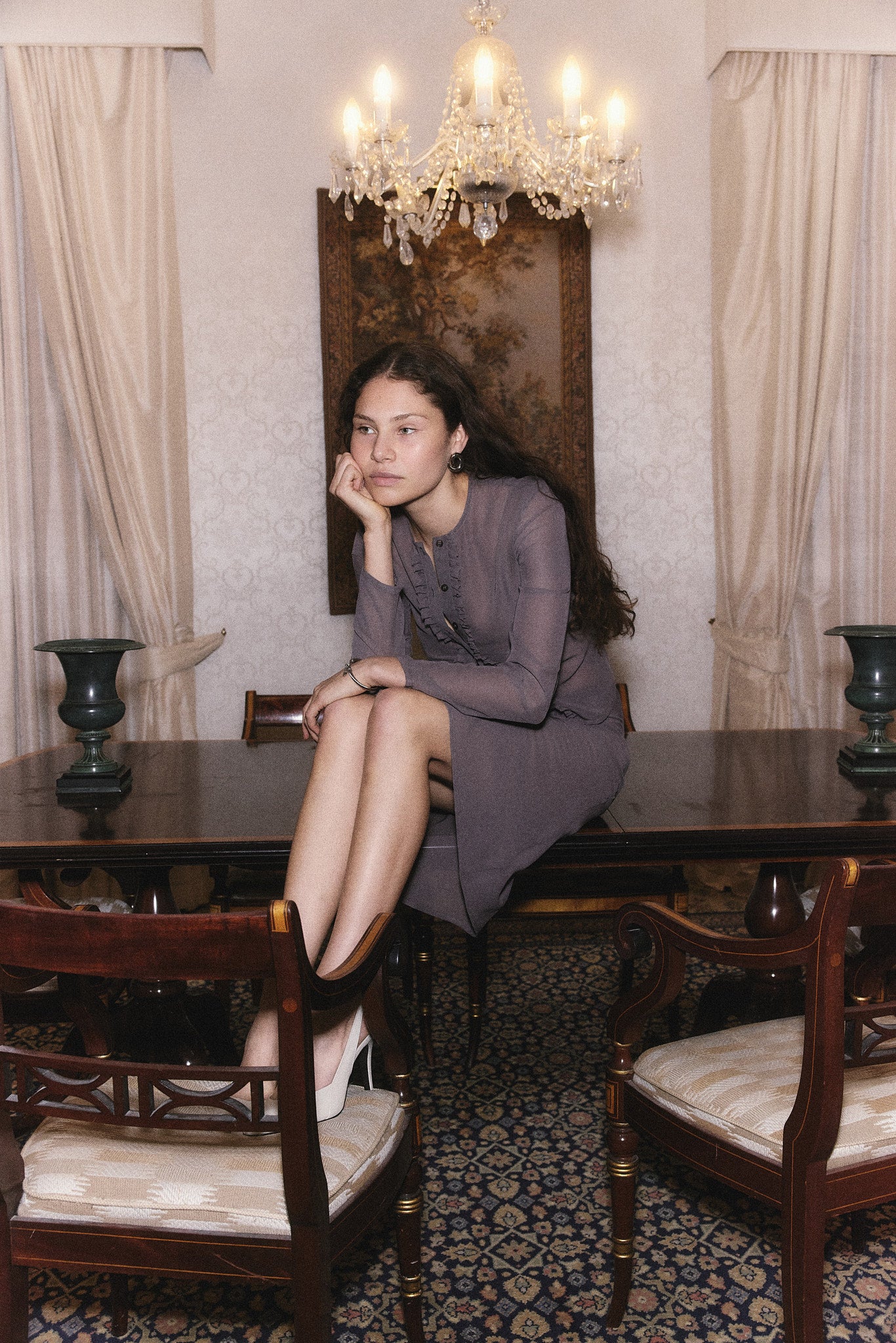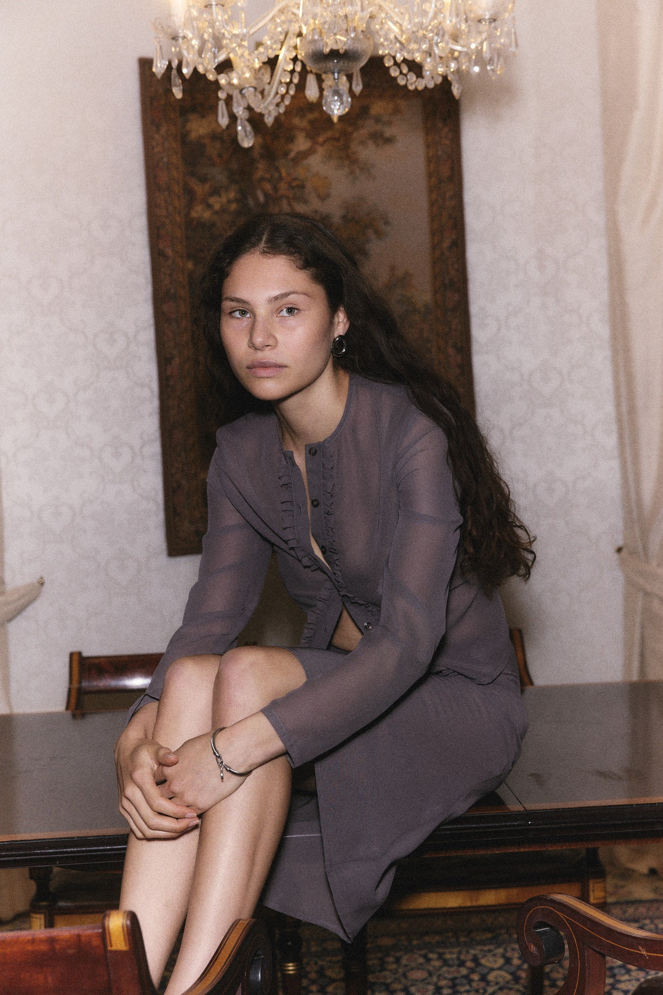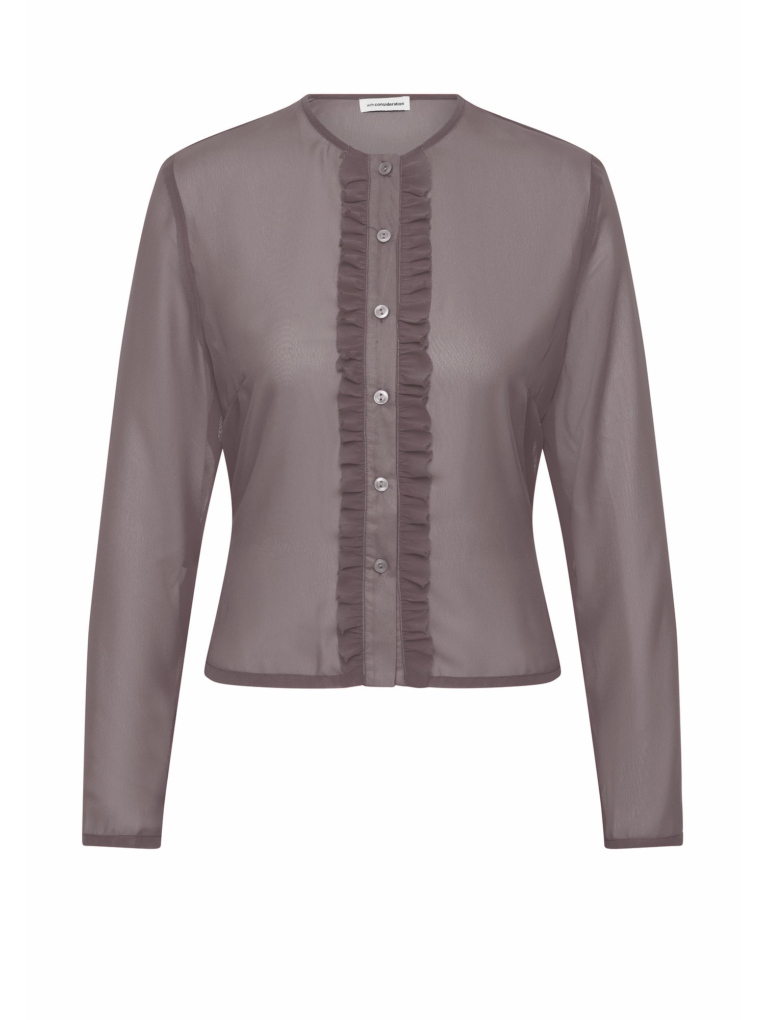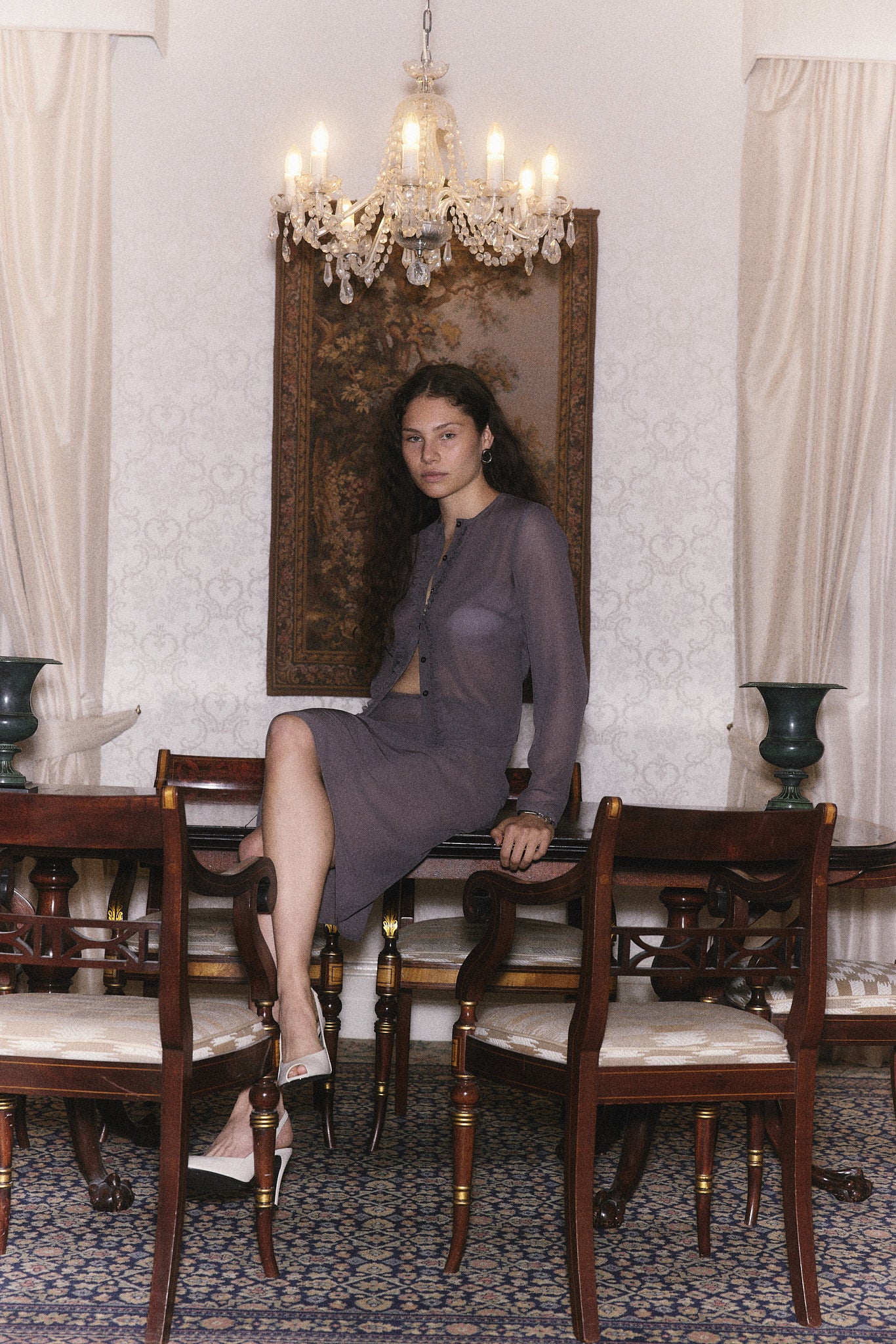 Lightweight and fluid, this sheer button-up features soft ruffles and a subtle texture. A tie at the back allows you to softly cinch the waist or leave it loose for a relaxed fit. Pair it with the matching skirt or with your favourite pair of vintage jeans.