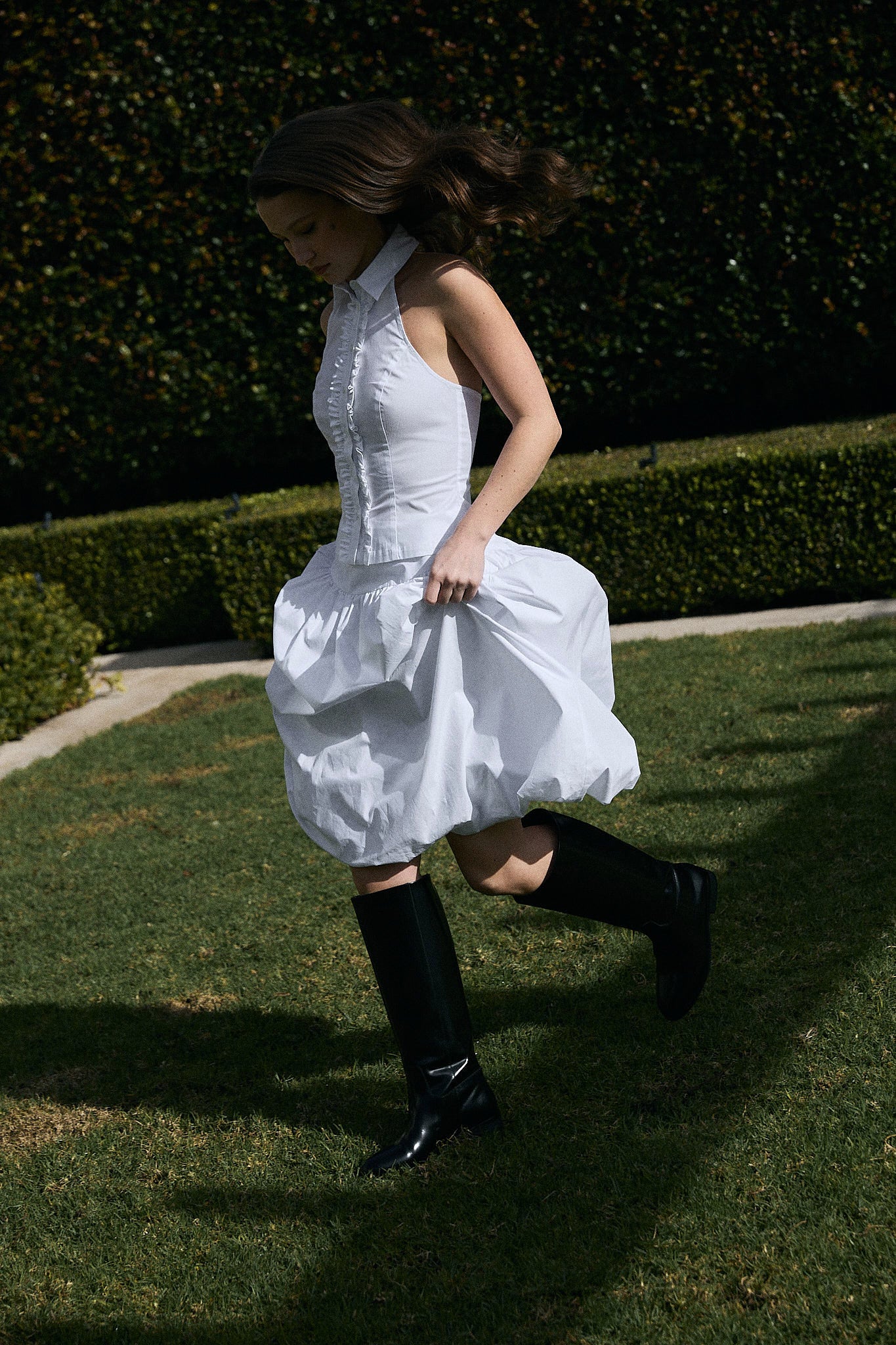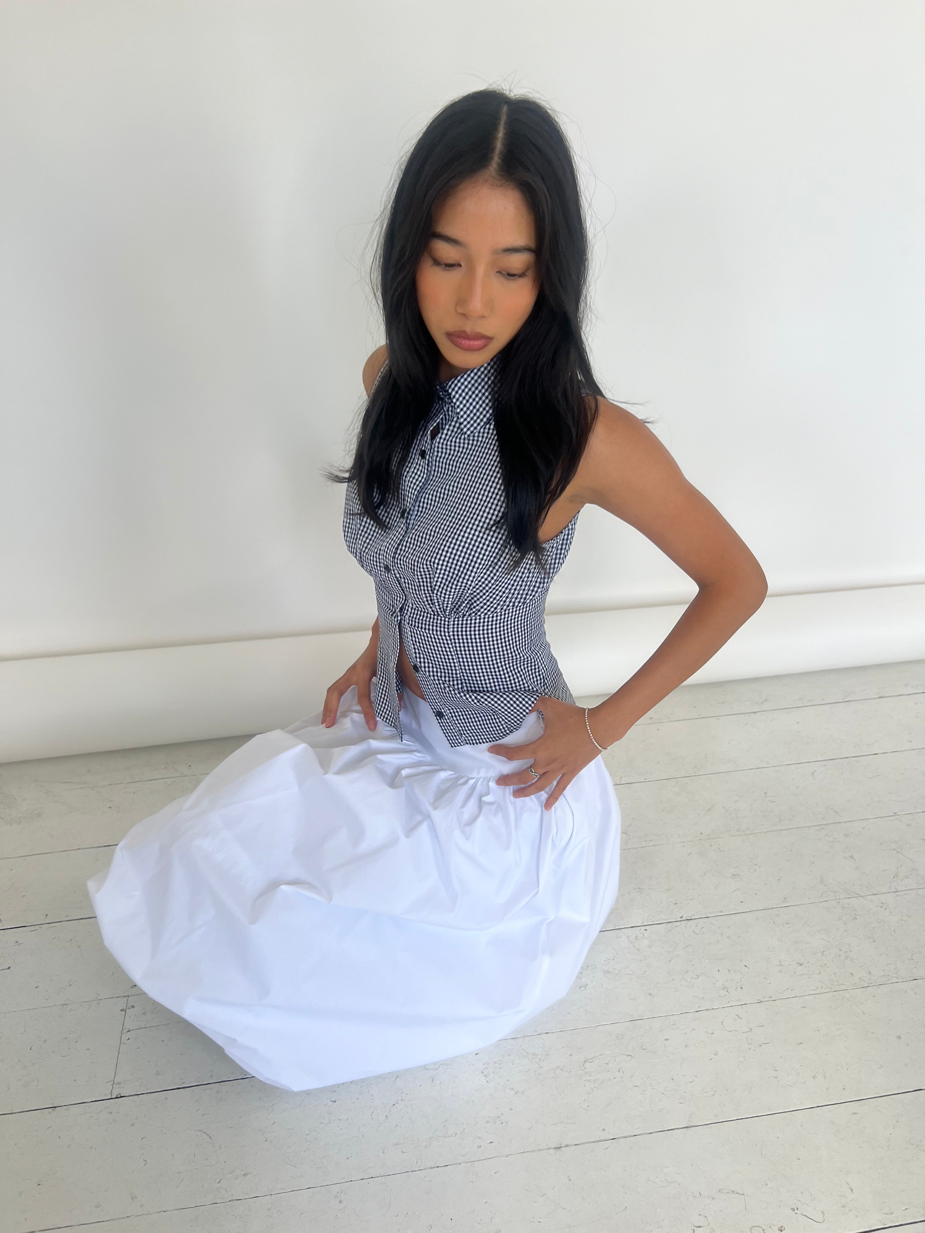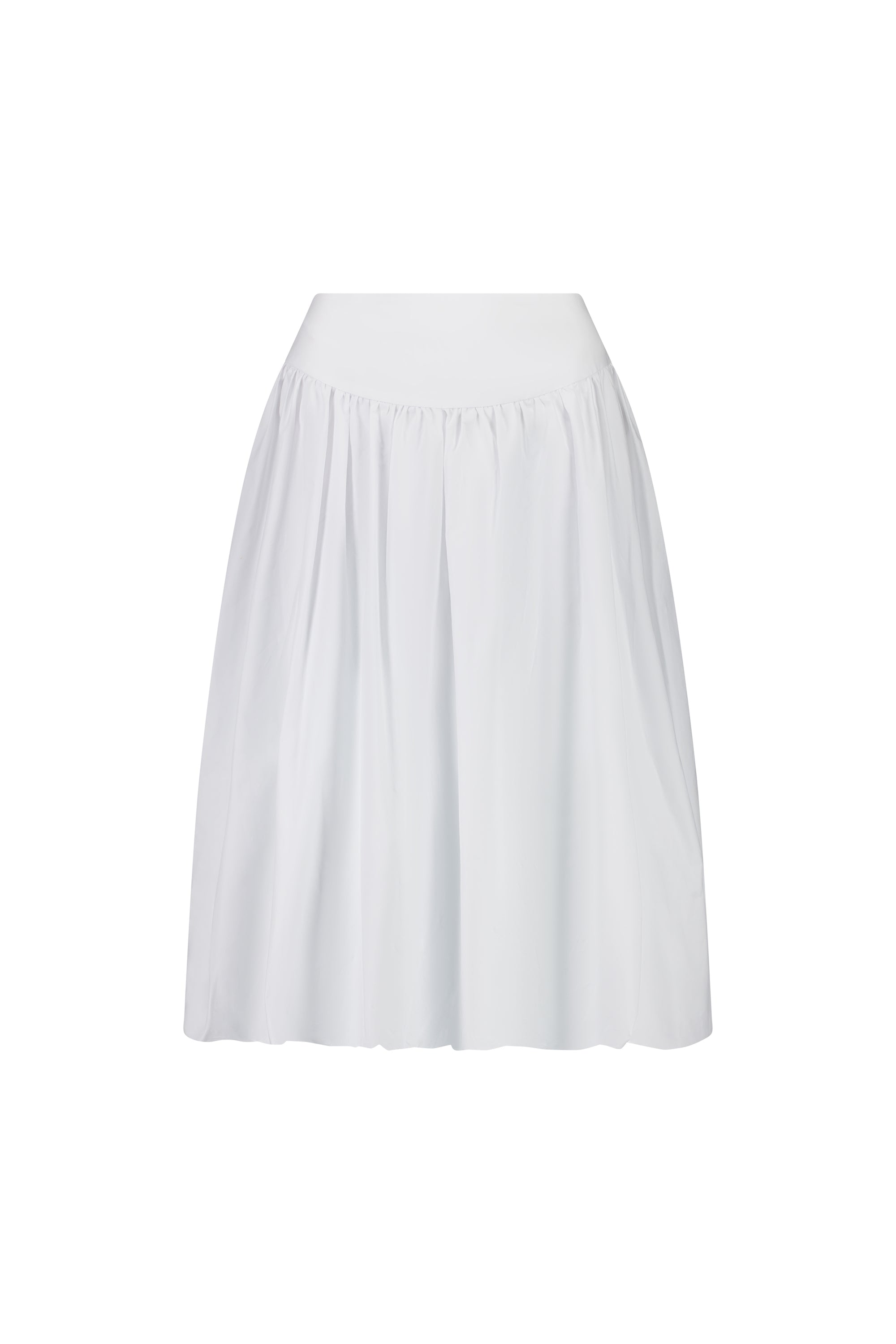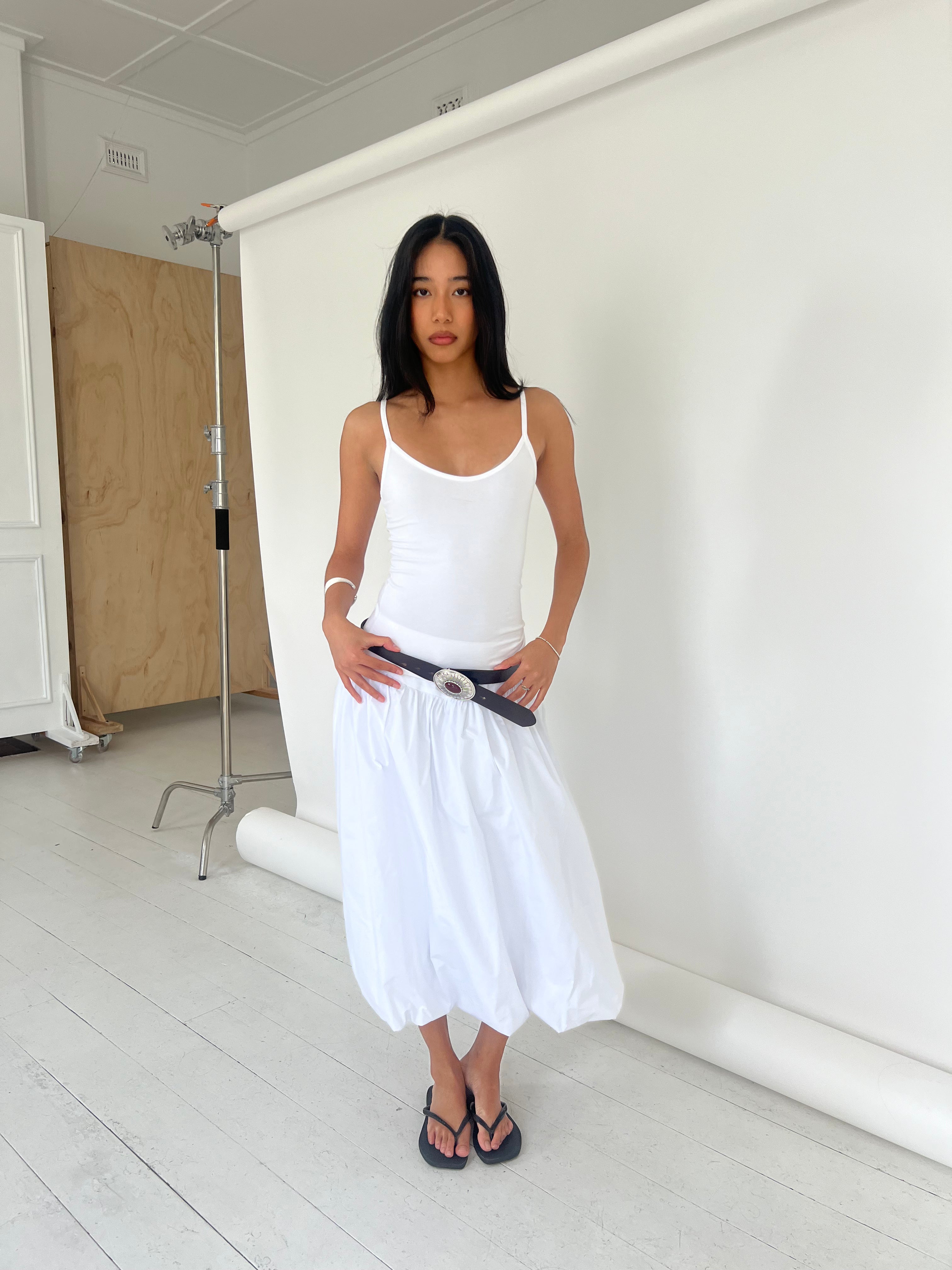 The Bubble Midi Skirt is a mid-rise, midi length skirt featuring a bubble hem and a wide waistband. Crafted from a lightweight cotton poplin, offering effortless movement.